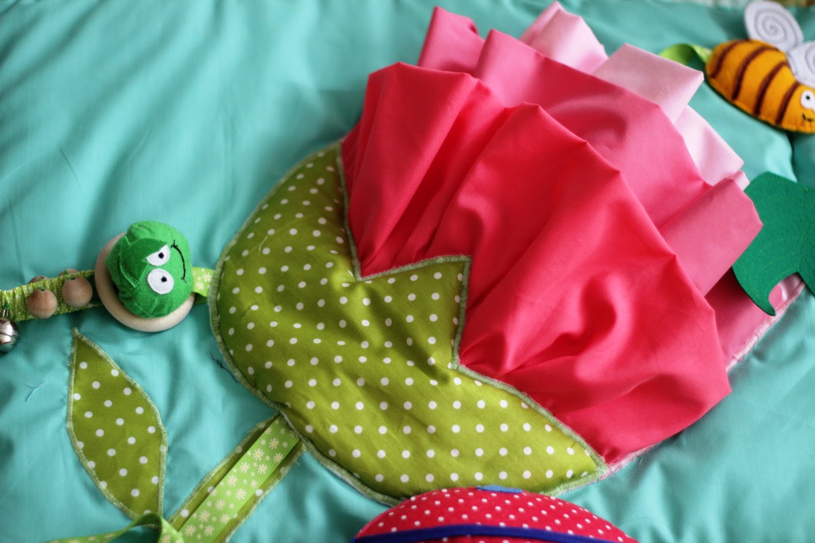 самые крупные бусины -на объемных божьих коровках, по 2см в диаметре, и эти божьи коровки расположены так, как впрочем и цветочки, чтобы каждый шаг ребенка приходился на активные точки, и согласно поступи. Захотелось сделать красочную цветовую палитру, чтоб все так гармонично-ярко-красиво-любо-дорого смотреть)))))) детям понравилось, ходят ногами-руками, все щупая, и не отрывая, потому как невозможно пришивала все ирисовскими нитками, что для вязания) так что все крепенько)))) Смотрим:
